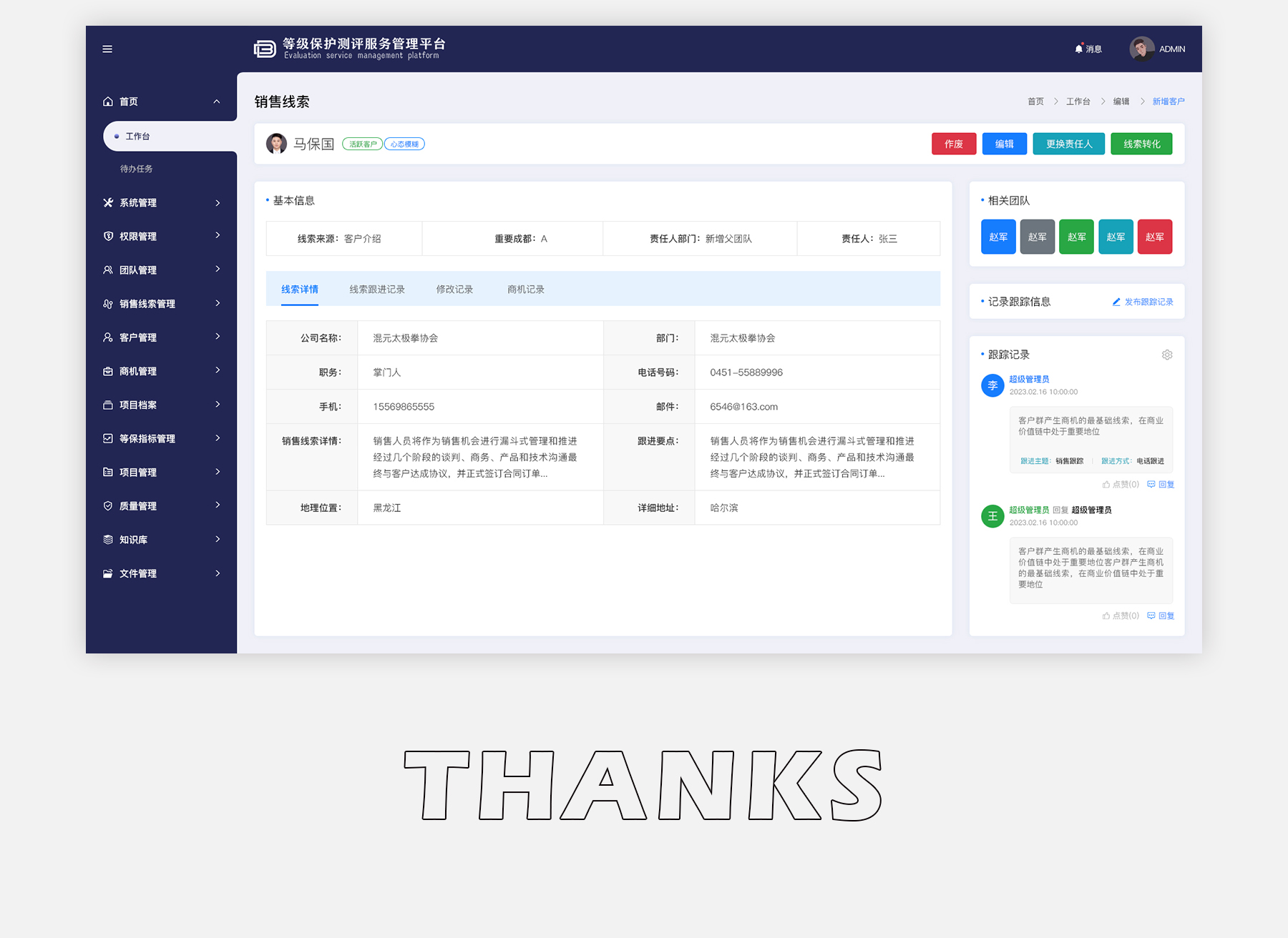 数据报表、团队管理、客户管理、商机管理、档案管理、质量管理、文章系统、文件管理;